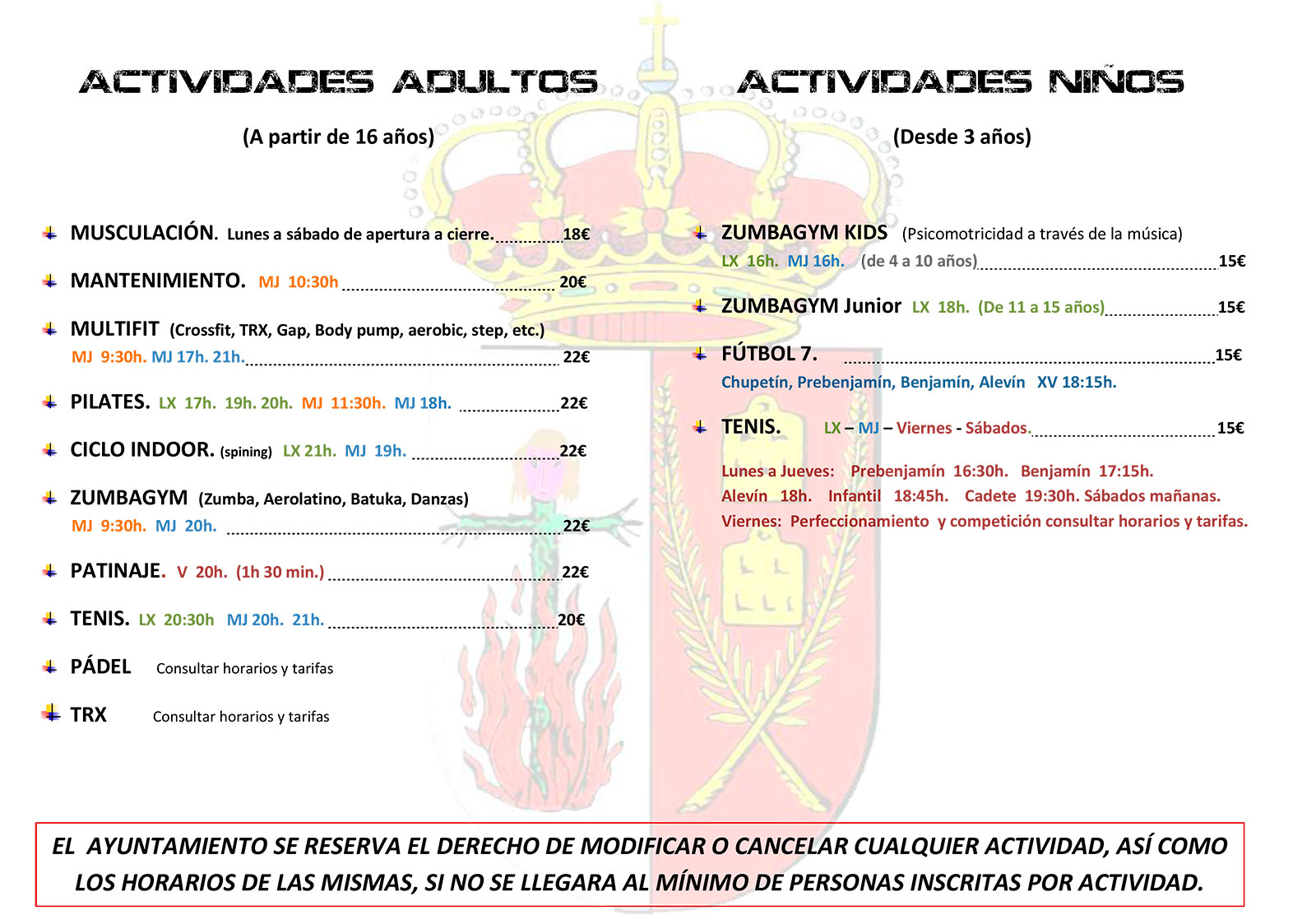 El Ayuntamiento se reserva el derecho a modificar o cancelar cualquier actividad, así como los horarios de las mismas, si no se llegara al mínimo de personas inscritas por actividad