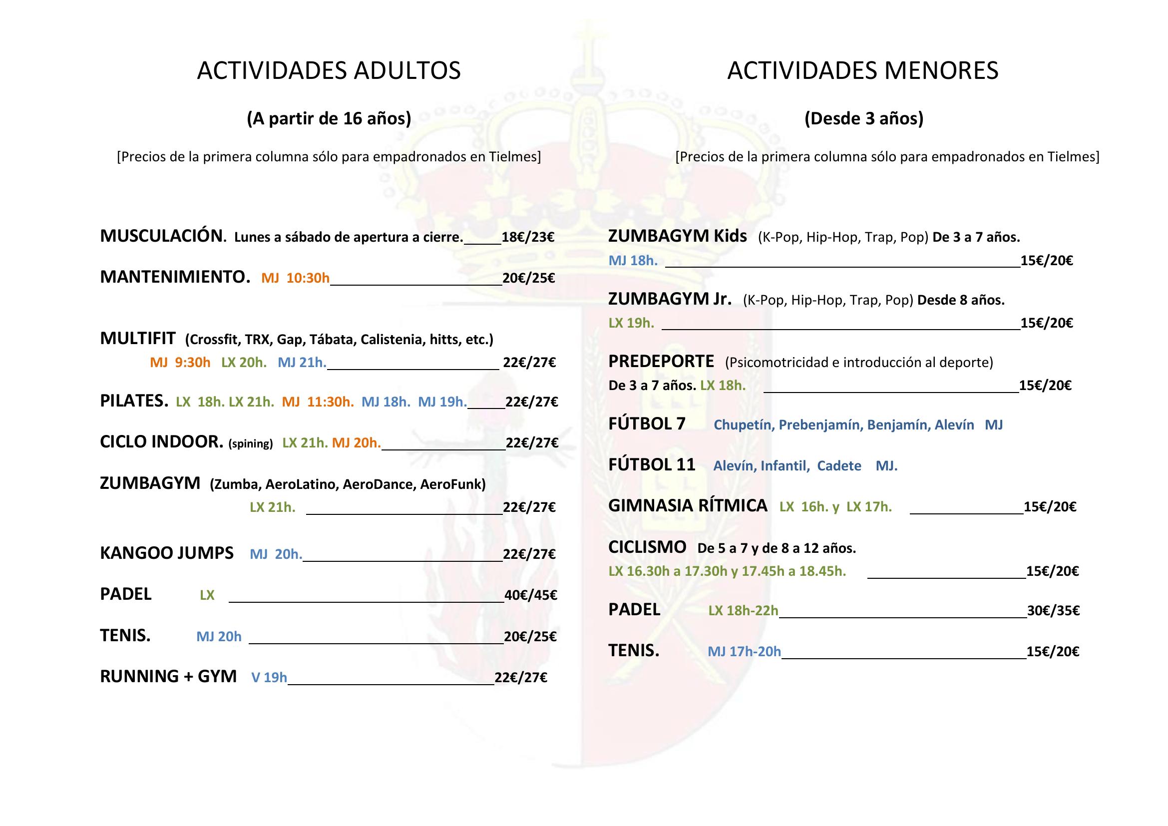El plazo de inscripción se abre el día 2 de septiembre y se cierra el 28 de septiembre. las inscripciones se pueden hacer online enviándose al correo electrónico polideportivo@tielmes.es hasta el día 28 de septiembre. Mandando las inscripciones completas( (dos hojas).